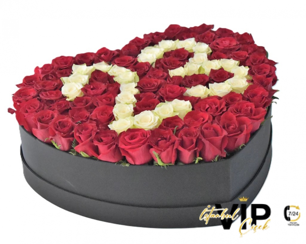 KALP KUTU İÇERSİNDE 75 ADET KIRMIZI GÜLLER VE YAZMAK İSTEĞİNİZ SAYI VE HARFLER BEYZ GÜLLERDEN TASARLANMAKTADIR