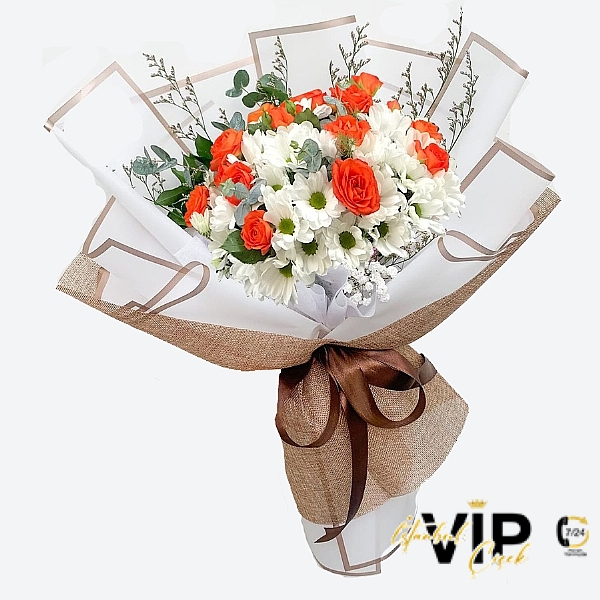 BEYAZ PAPATYALAR VE TURUNCU ÇARDAK GÜLLERDEN BUKET