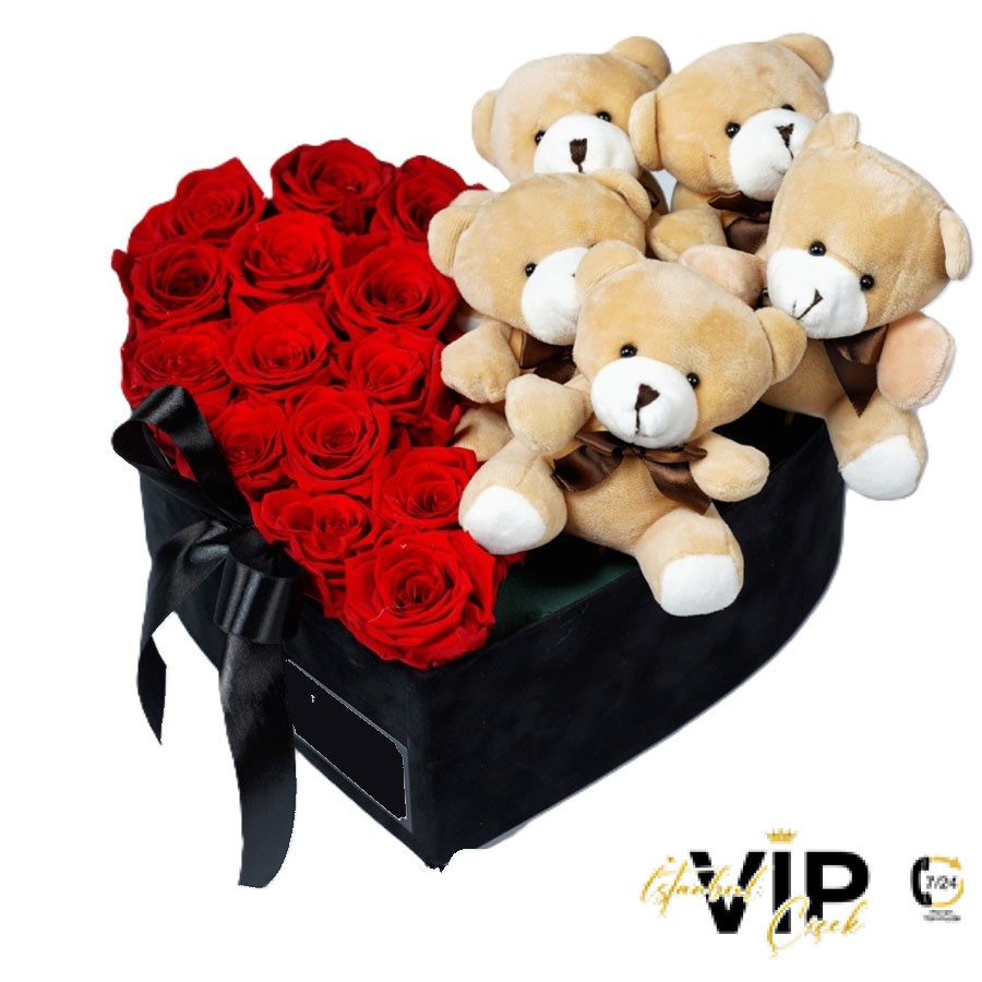 15 ADET KIRMIZI GÜLLER VE 5 ADET SEVİMLİ AYICIKTAN TASARLANMIŞ KALP KUTU